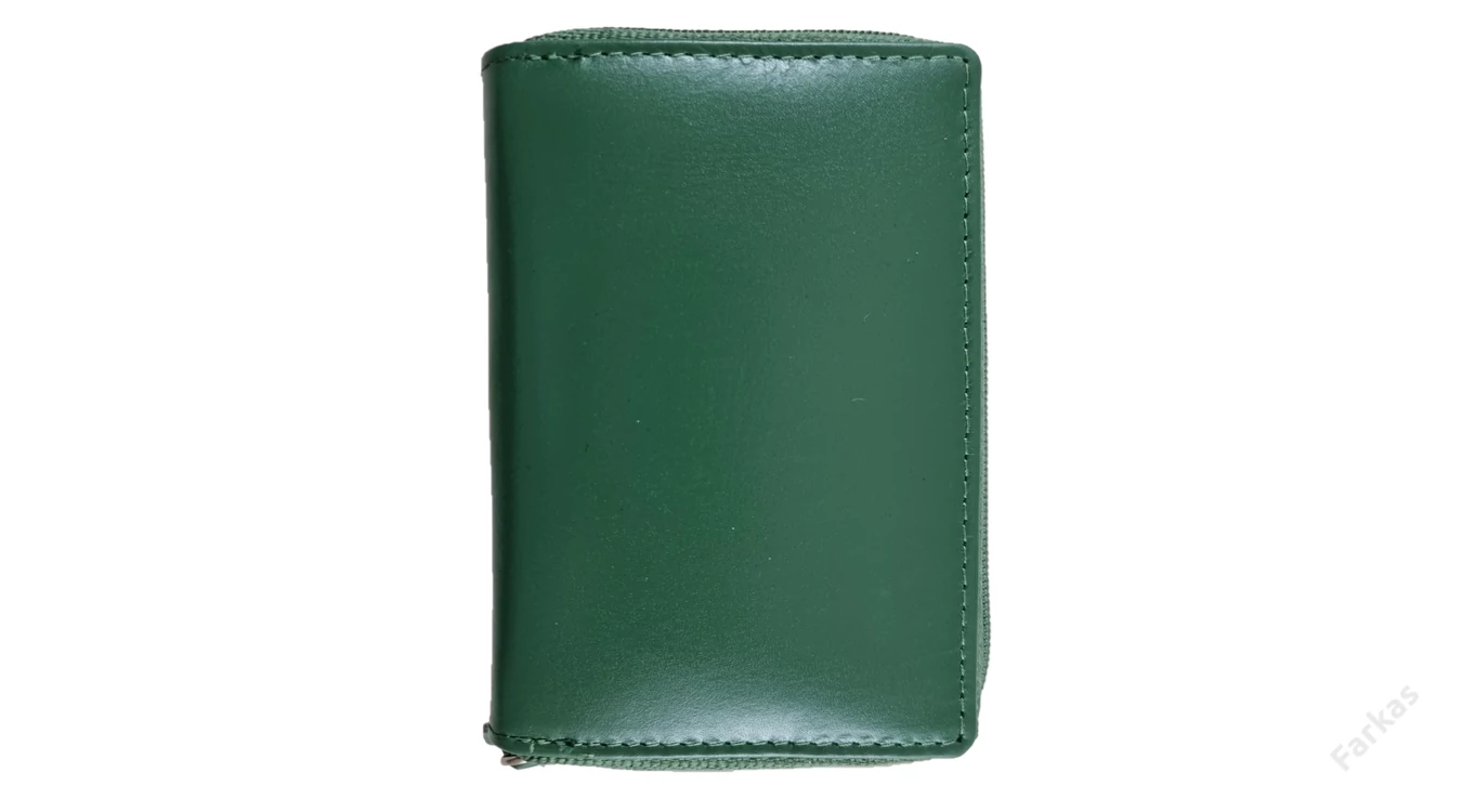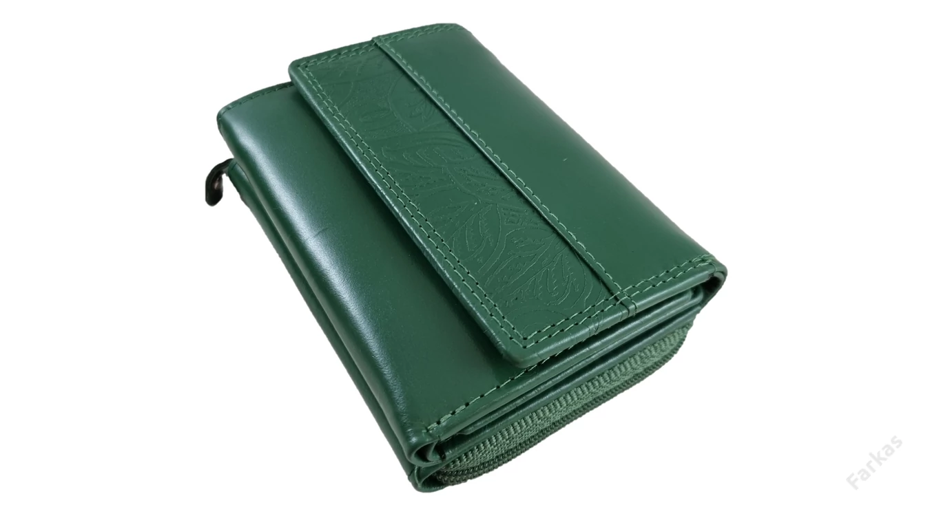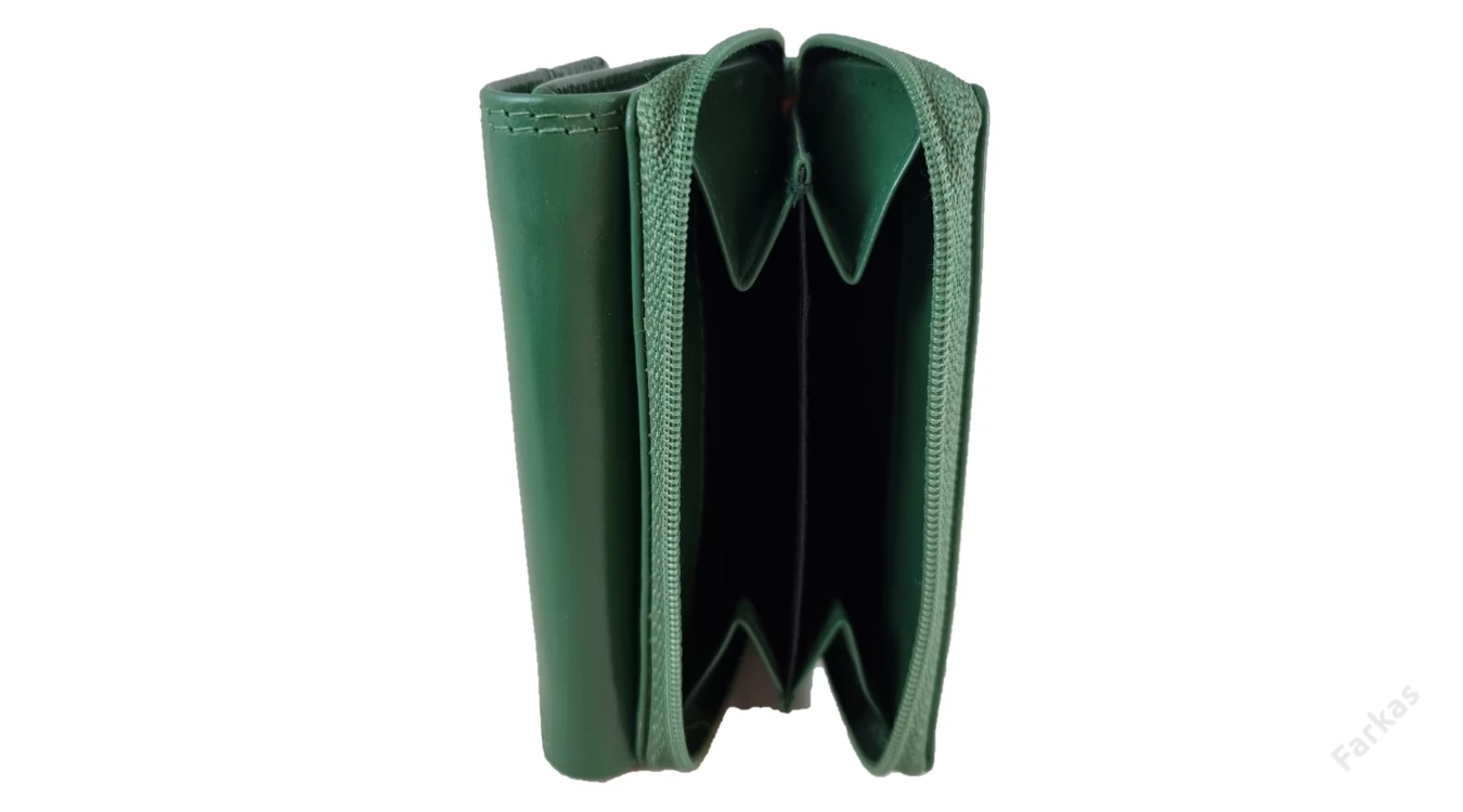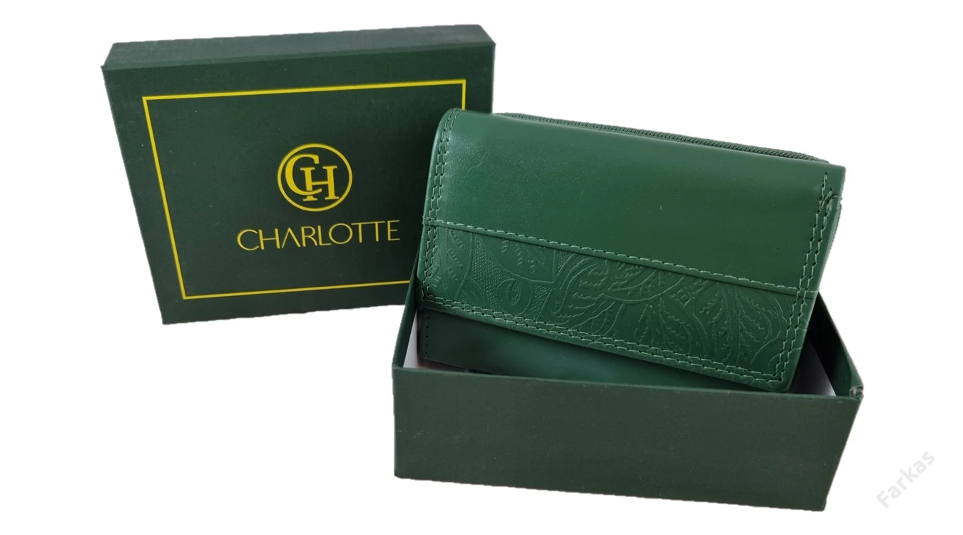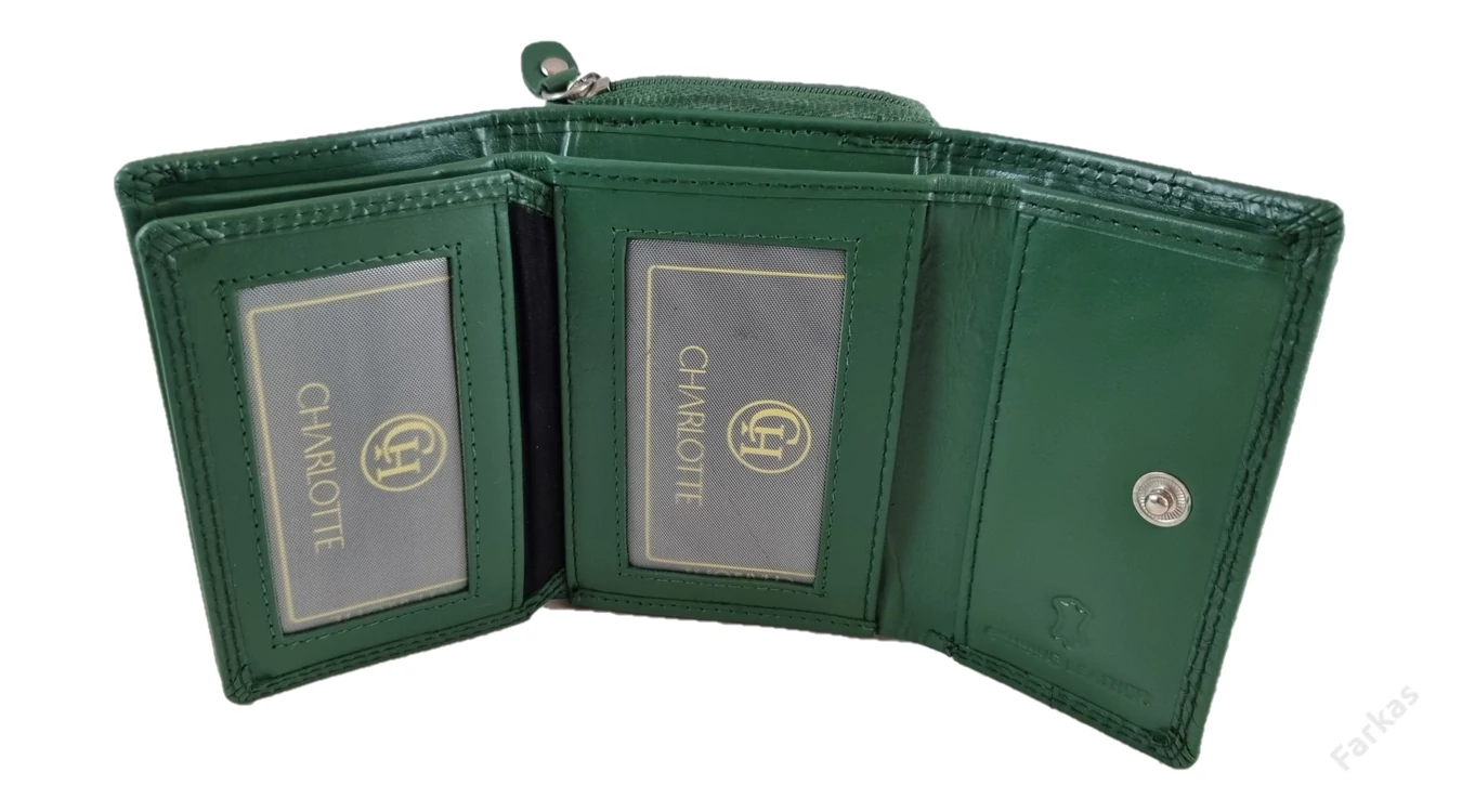 CHARLOTTE márkájú, kis  méretű női pénztárca. A termék kiváló minőségű, fényes bőrből készült. Fedelét patenttal tudjuk kinyitni. Belsejében található egy 1 rekeszes papírpénztartó és 6 db kártyatartó hely. A pénztárca hátulján van elhelyezve egy kőrcipzárral nyíló, két rekeszes aprópénztartó. A pénztárcát igényes díszdobozban kínáljuk.