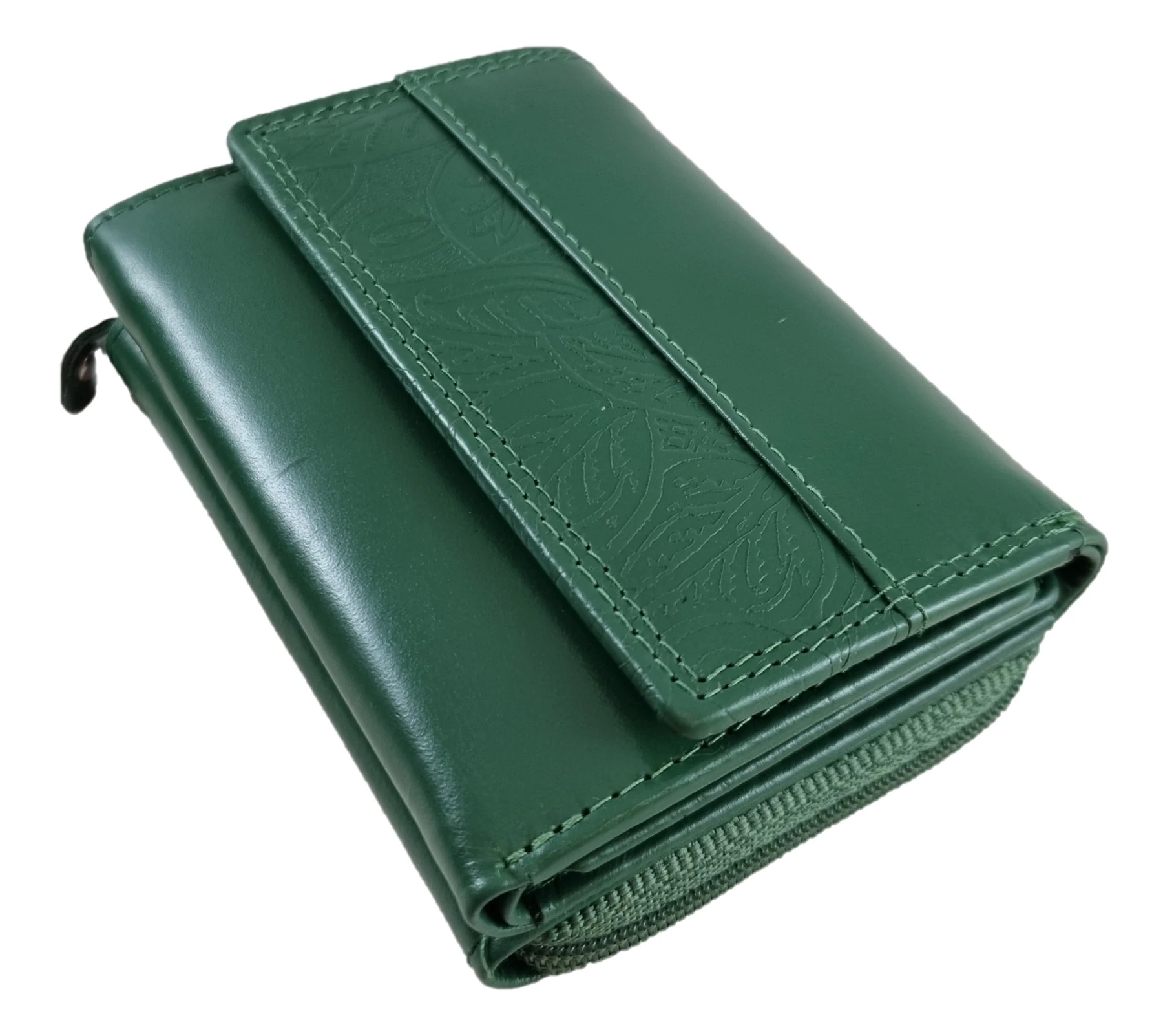 Kisméretű női pénztárca, fényes bőrből és divatos mintával.