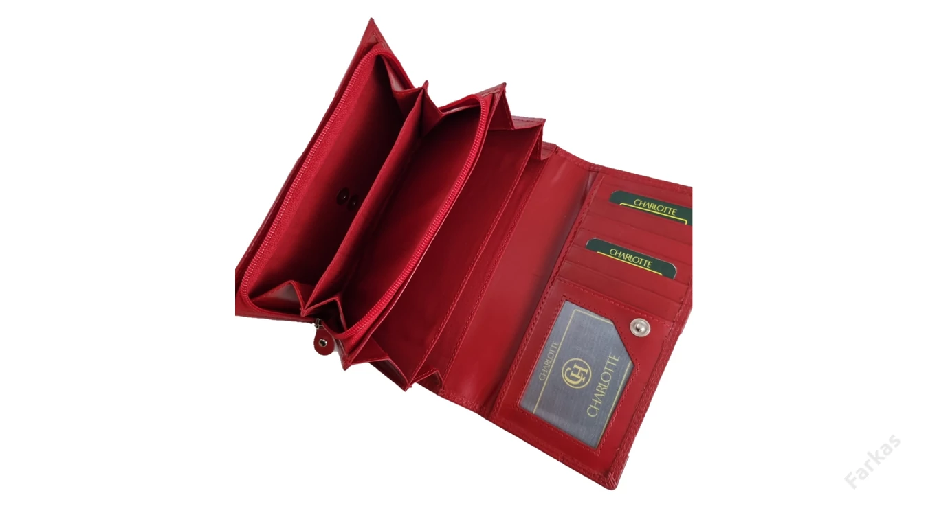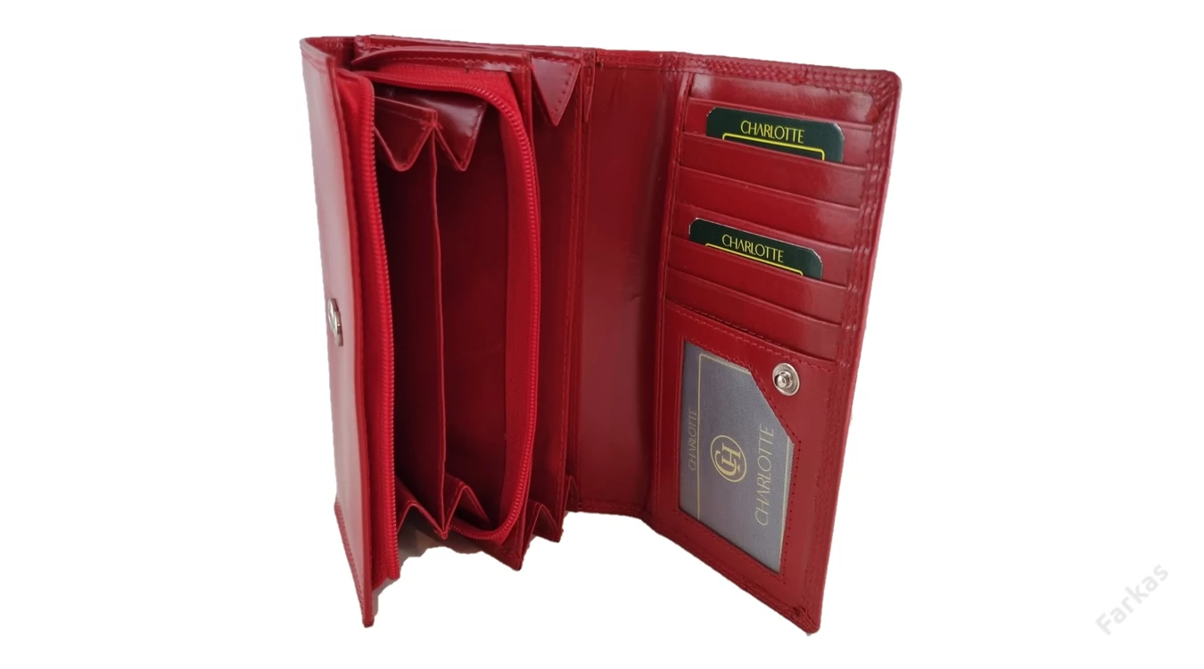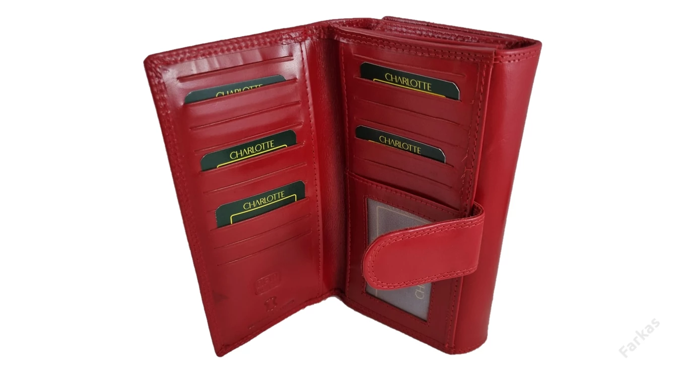 Nagy méretű női pénztárca, mely sok kártyatartó hellyel rendelkezik.. Saját termékünk, így szeretettel ajánljuk azoknak a Vásárlóinknak, akik szeretik a minőséget és az egyediséget. A pénztárcához igényes díszdoboz is jár. A fedele patenttal nyitható. Belsejének elrendezése klasszikus: egy 2 rekeszes papírpénztartóval, egy körcipzárral nyíló, 2 rekeszes aprópénztartóval, 2 igazolványtartó zsebbel és 7 db kártyatartó hellyel rendelkezik, ezek közül az egyik "ablakos". A pénztárca hátulja egy átkapcsoló fülecskével nyitható, itt további kártyatartó helyek vannak, összesen 17 kártyának és 2 (nagyobb) igazolványtartónak.