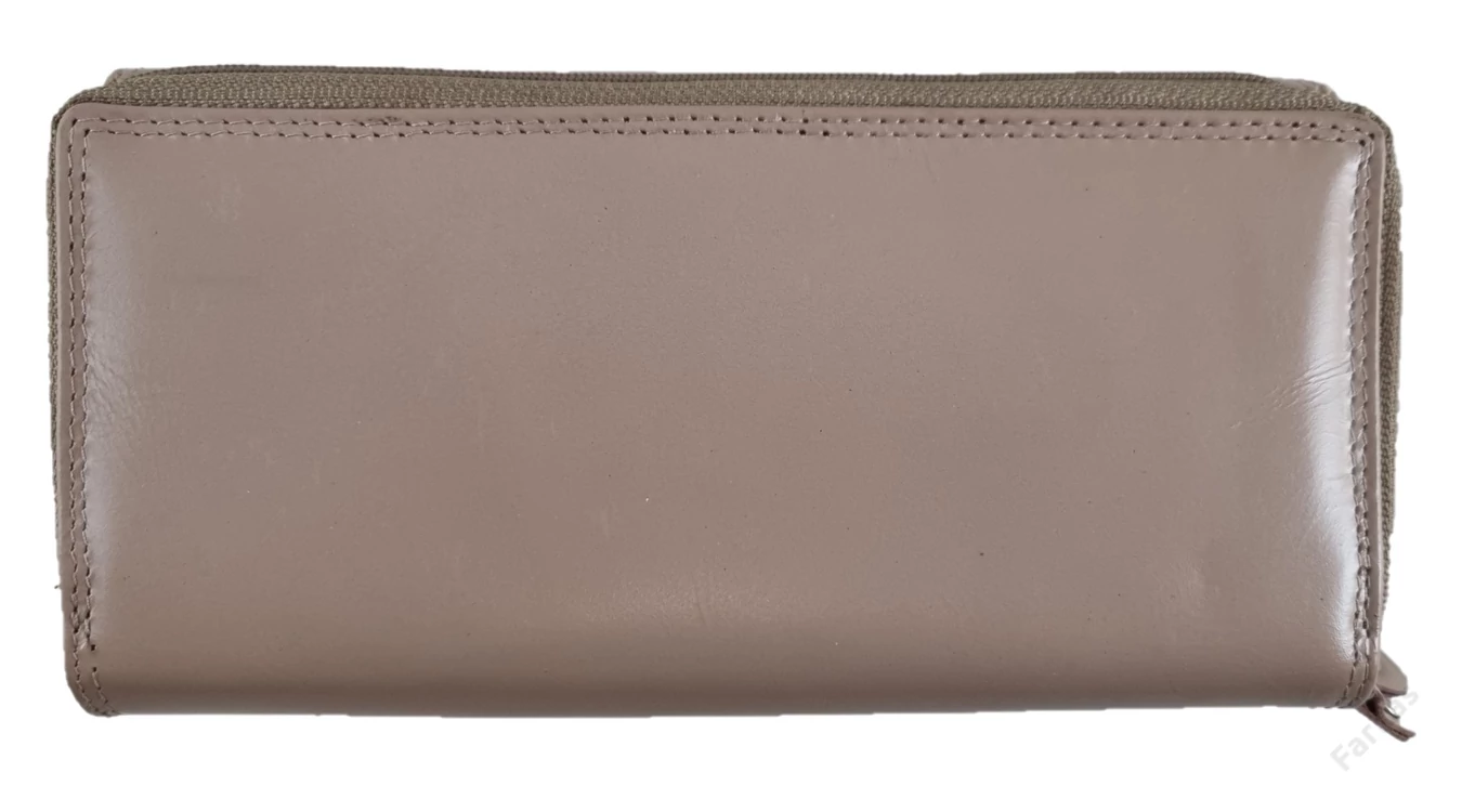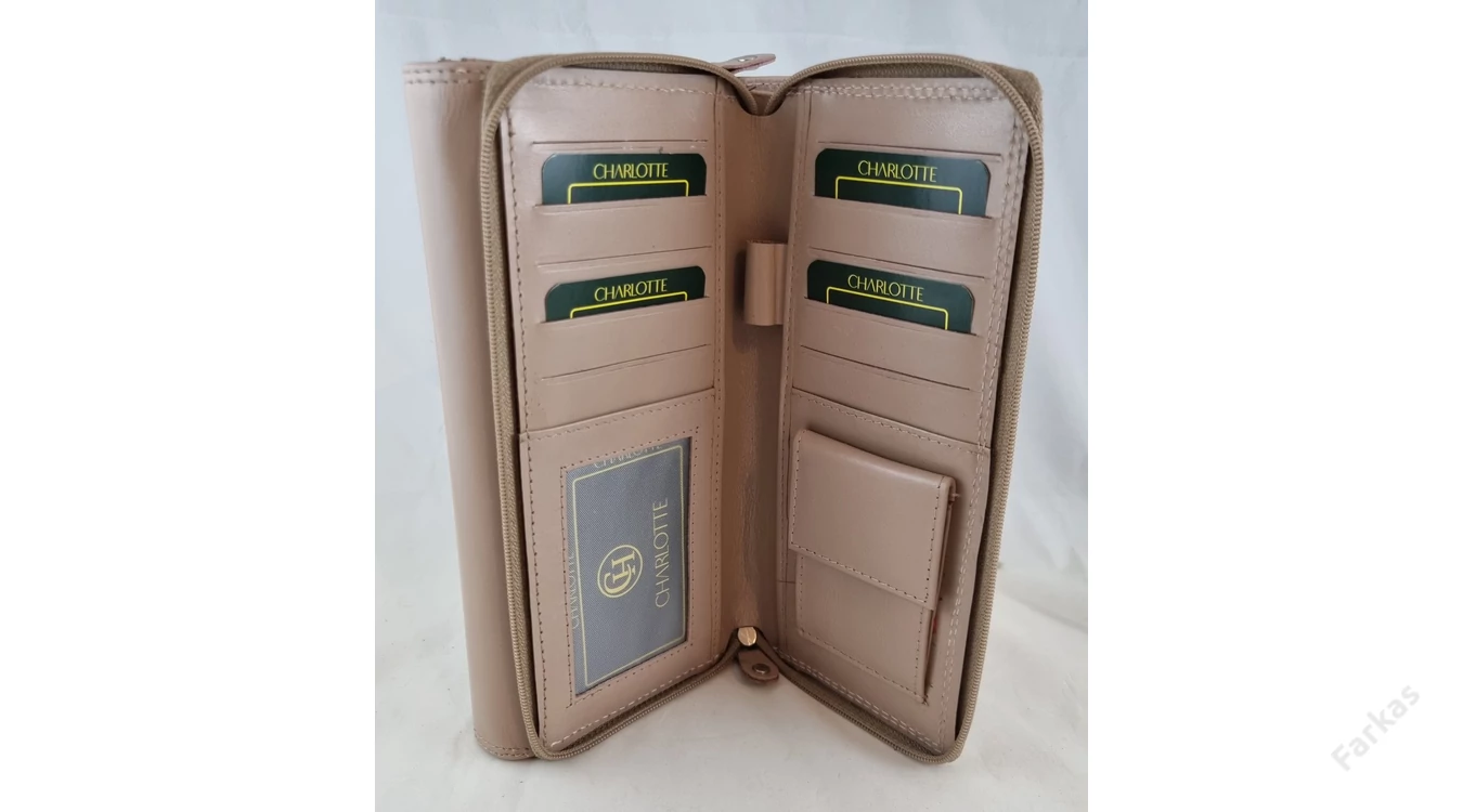 A fedele patenttal nyitható. Belsejének elrendezése klasszikus: egy kétrekeszes papírpénztartó, egy körcipzárral nyíló, kétrekeszes aprópénztartó és egy cipzáras zseb található. Összesen 10 db kártya és 1 nagy igazolvány elférnek. A pénztárca hátulja körcipzárral nyitható, itt további kártyatartó helyek, egy toltartó hely és egy kis patenttal nyíló zsebecske vannak, összesen 12 kártyának és 2 (nagyobb) igazolványtartónak van itt hely.