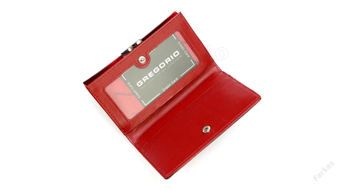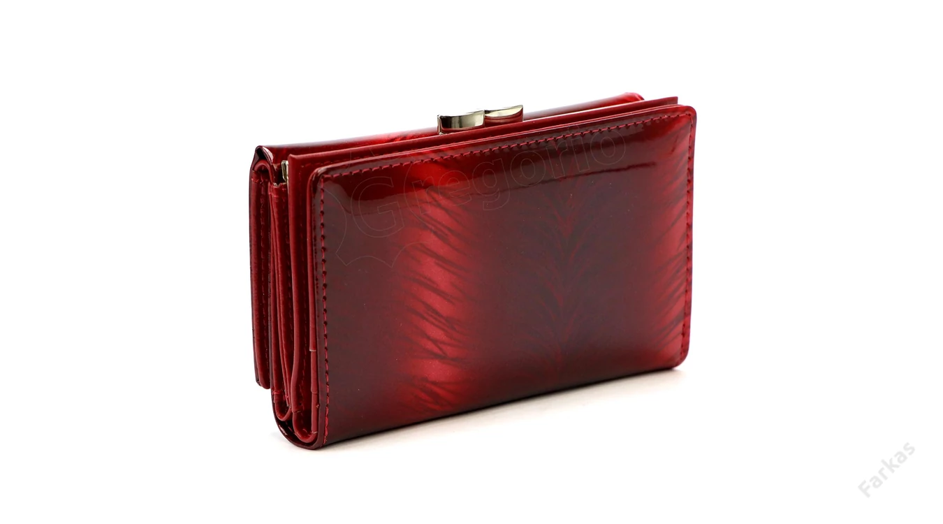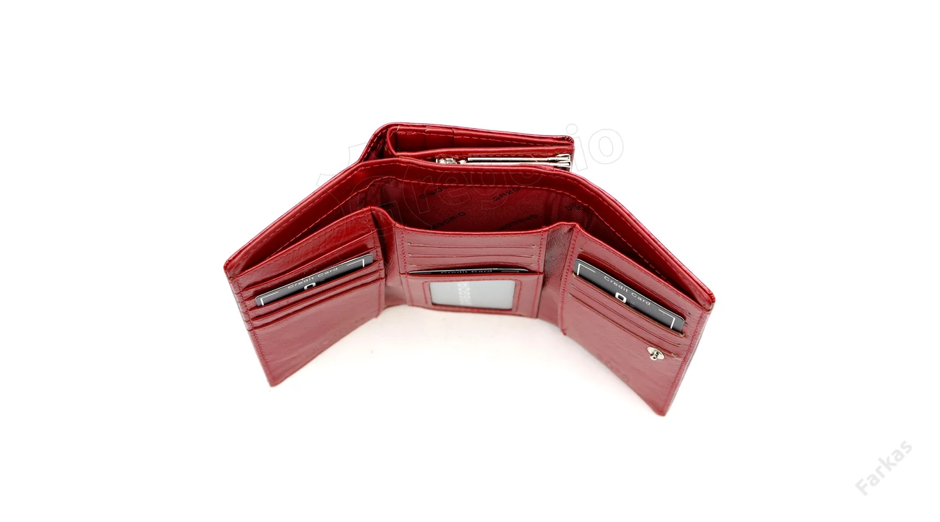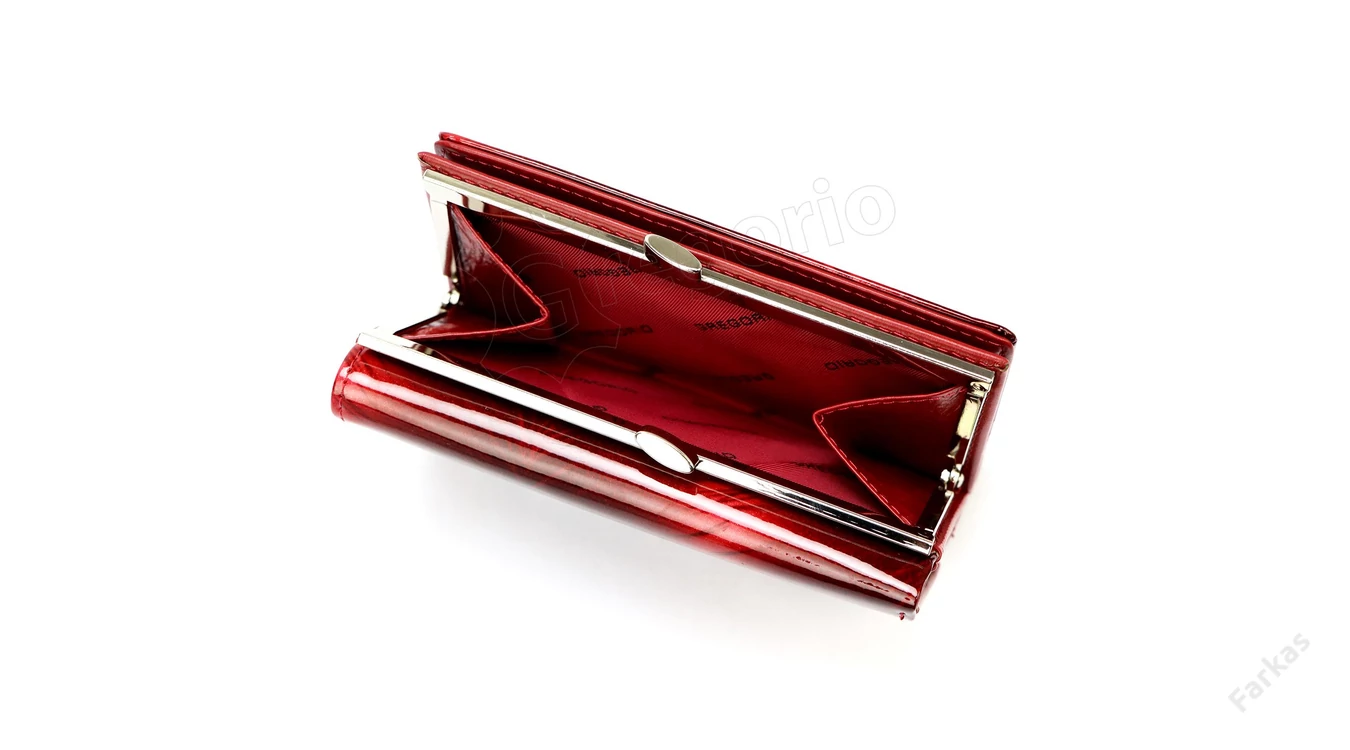 Keretes lakkbőrből készült pénztárca díszdobozban. A fedele patenttal nyitható: egy 1 rekeszes papírpénztartó, 14 db kártyatartó hely (abból 1 ablakos) és 3 igazolványtartó hely található benne. Egy fémkerettel nyílik a nagy méretű aprópénztartó. A pénztárca hátulja patenttal nyitható, itt további igazolványtartó helyek vannak, 4 db igazolvány elfér ide.