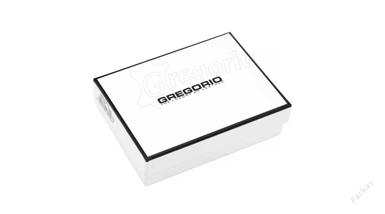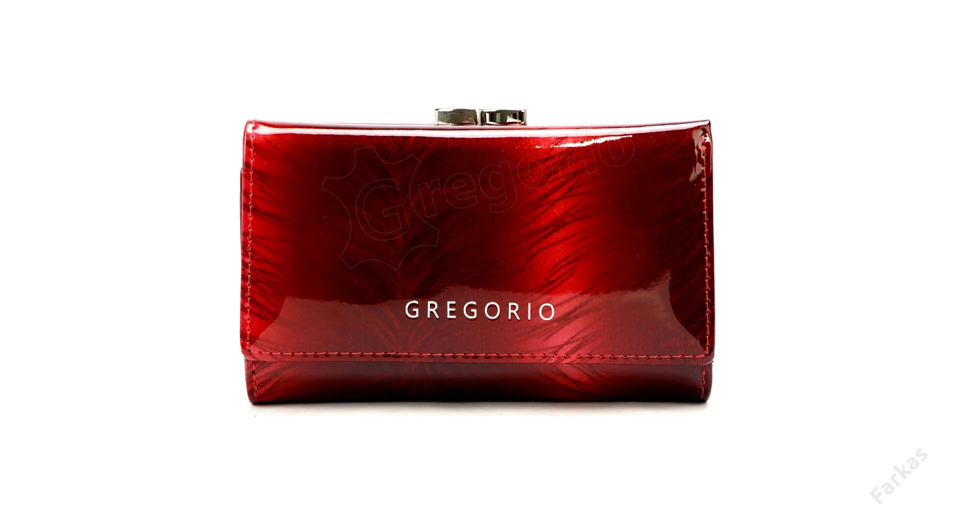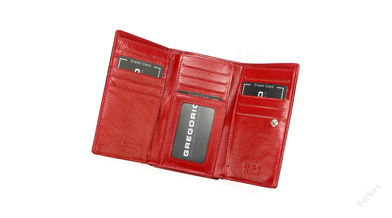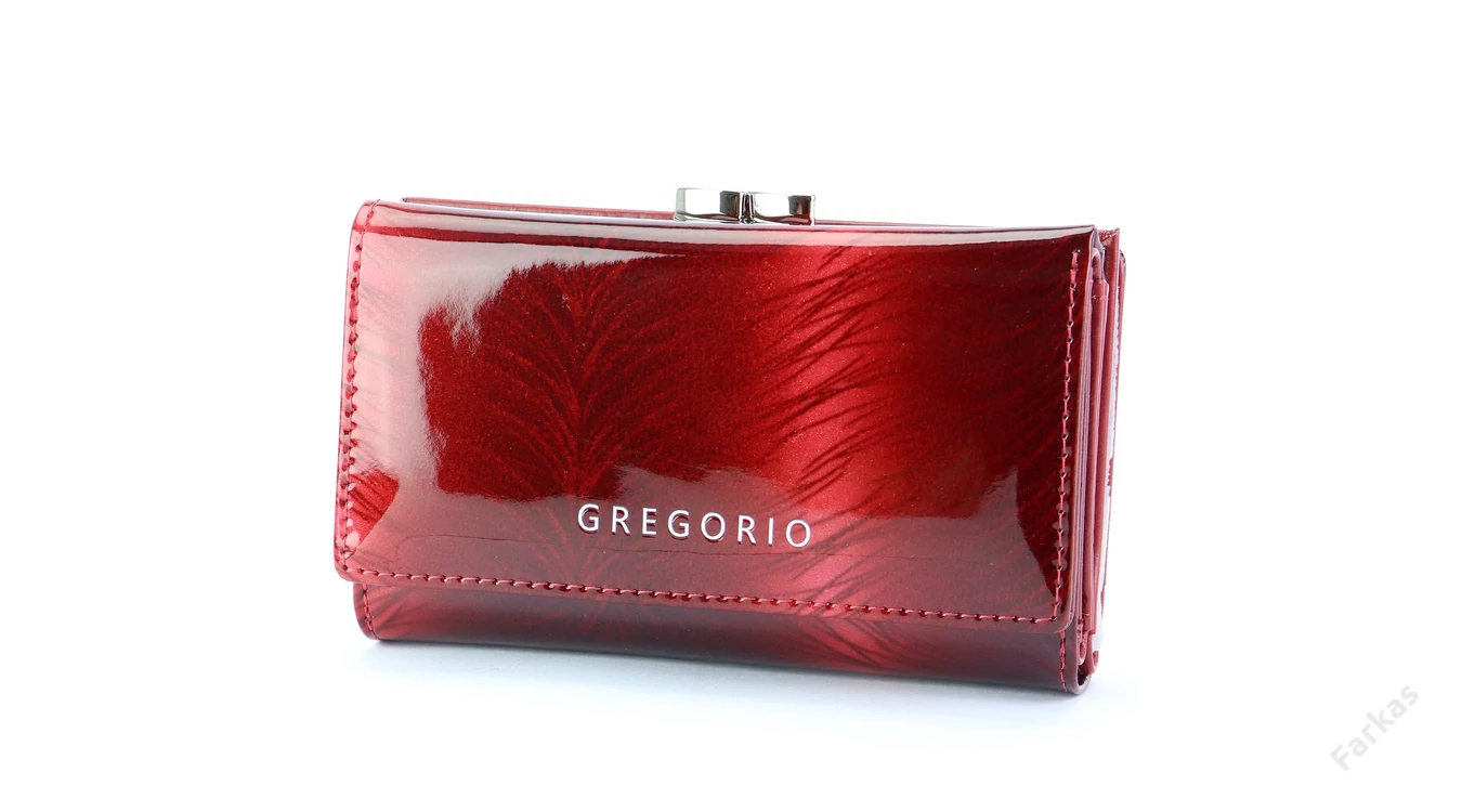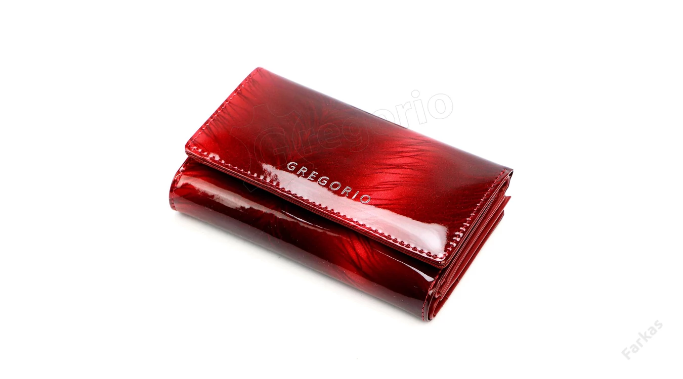 Keretes lakkbőrből készült pénztárca díszdobozban. A fedele patenttal nyitható: egy 1 rekeszes papírpénztartó, 14 db kártyatartó hely (abból 1 ablakos) és 3 igazolványtartó hely található benne. Egy fémkerettel nyílik a nagy méretű aprópénztartó. A pénztárca hátulja patenttal nyitható, itt további igazolványtartó helyek vannak, 4 db igazolvány elfér ide.