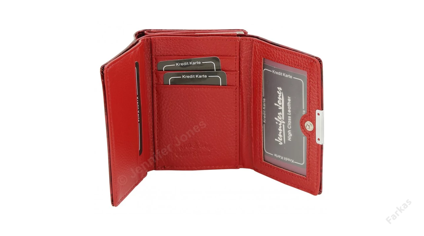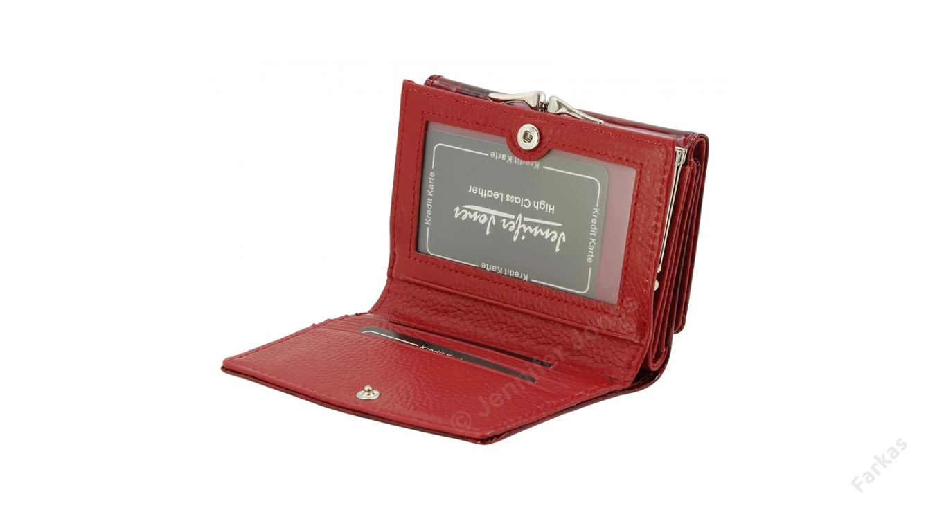 Keretes, lakkbőrből készült pénztárca pillangós mintával. A fedele patenttal nyitható: egy 1 rekeszes papírpénztartó, 3 db kártyatartó hely és 5 igazolványtartó hely (abból 1 ablakos) található benne. Egy fémkerettel nyílik az egyrekeszes aprópénztartó.A pénztárca hátuljánm egy további, patenttal nyíló kártyatartó rész el van helyezve, ahove további 5 db kártya vagy igazolvány elfér.