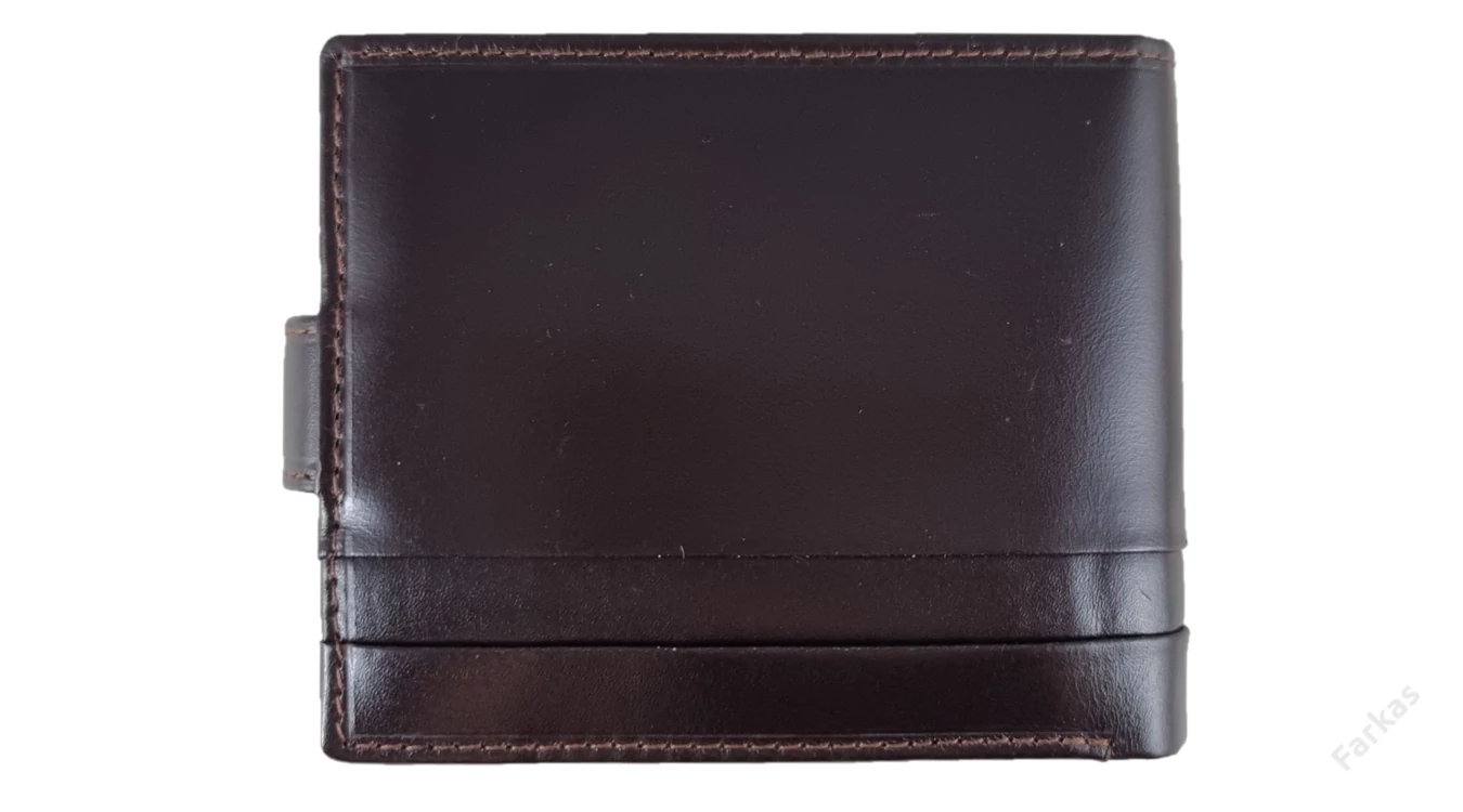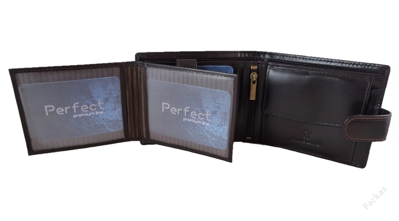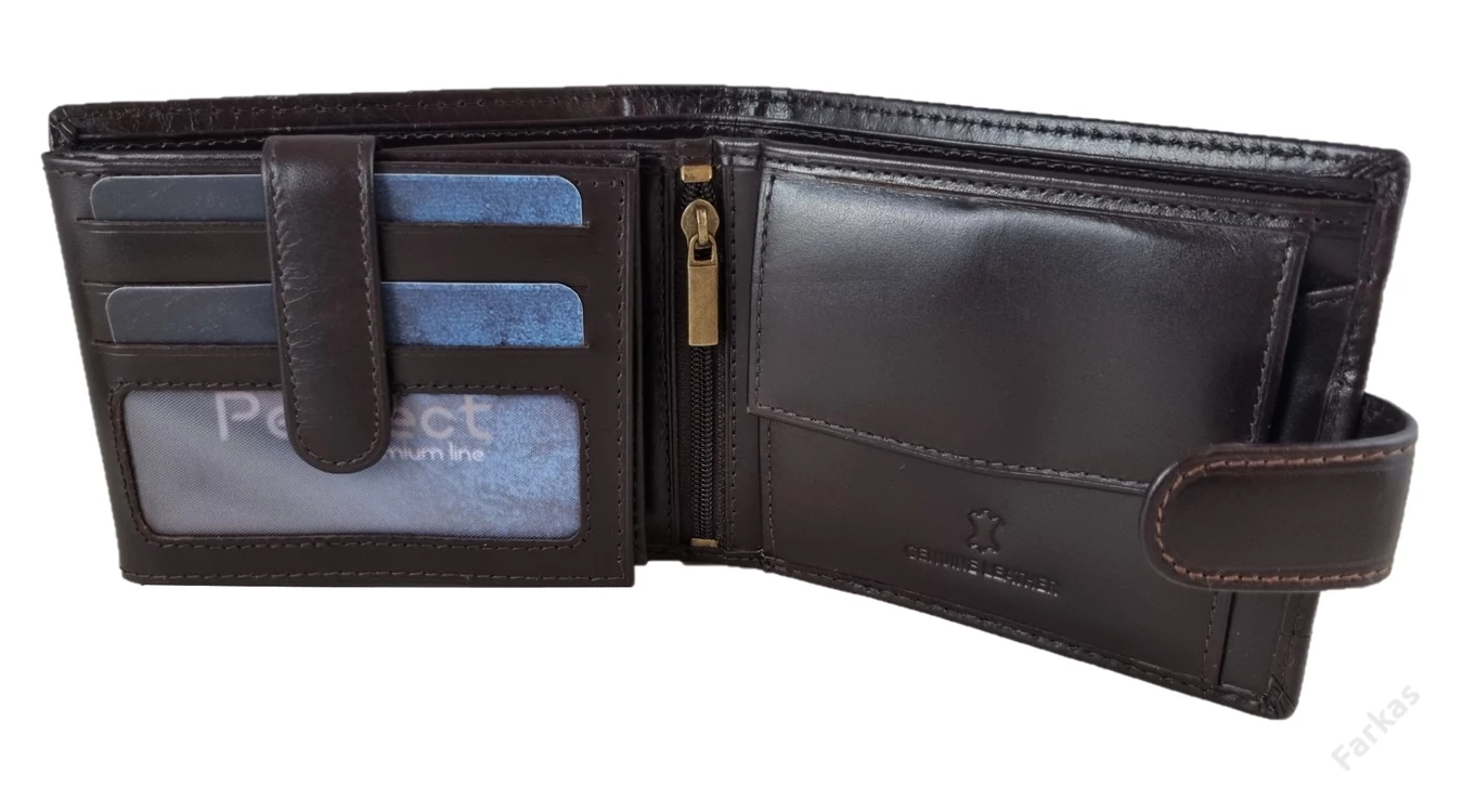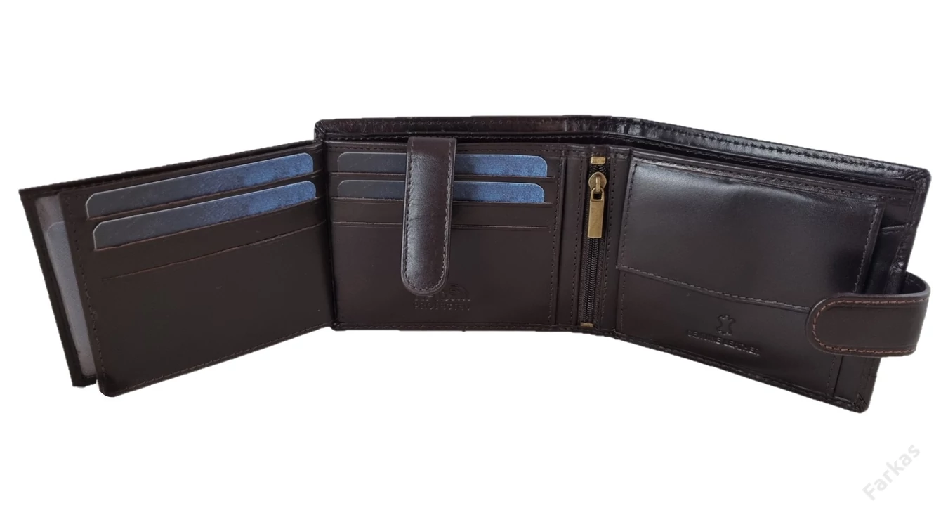 Férfi bőrpénztárca prémium minőségű bőrből. Fekvő fazon, mely patentos átkapcsolóval nyitható. Papírpénztartója két rekeszes, aprópénztartója patentos fedéllel nyílik.A pénztárca "gerincén" egy kis cipzáras zseb található. Belül a bal oldalon balra nyitható kártyatartókkal rendelkezik, melyek szintén átkapcsos patenttal nyithatóak. 9 db kártyának és 4 db igazolványnak van benn hely. Elegáns díszdobozban szállítjuk.