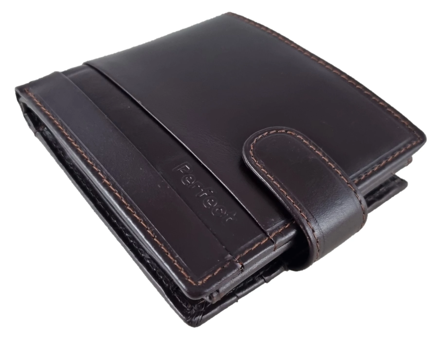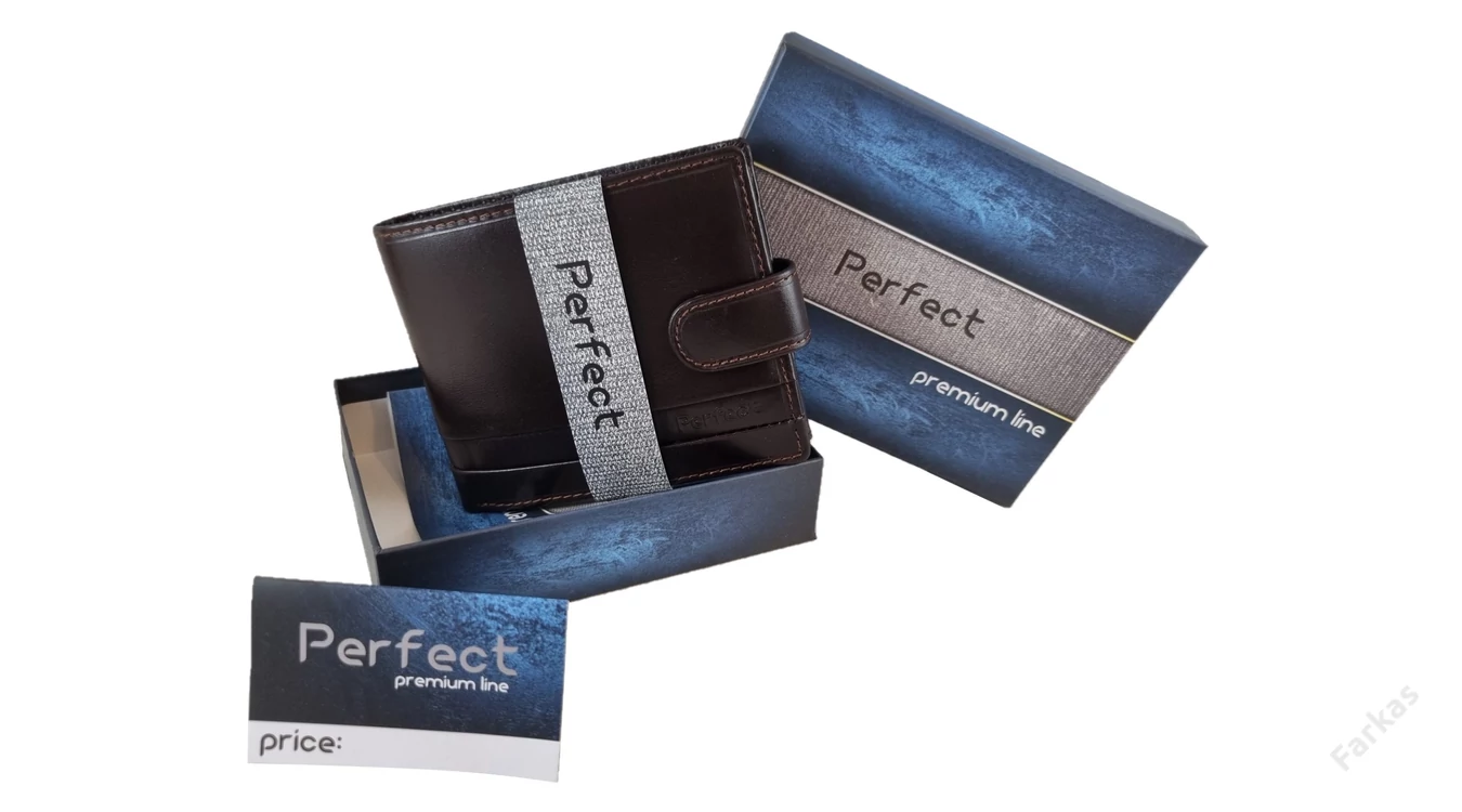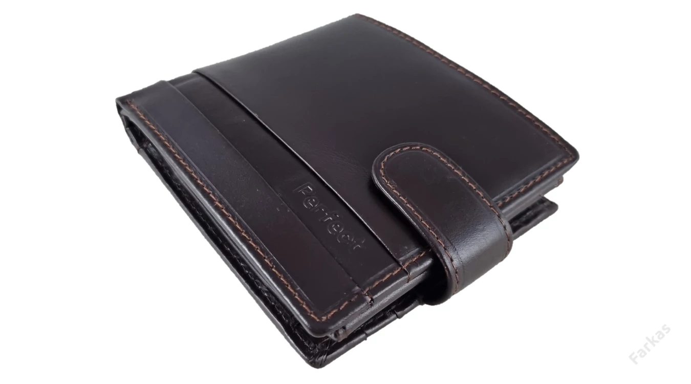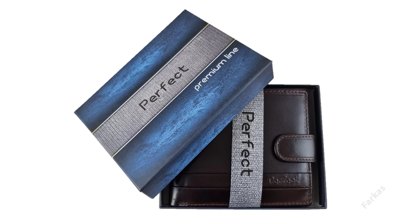 Férfi bőrpénztárca prémium minőségű bőrből. Fekvő fazon, mely patentos átkapcsolóval nyitható. Papírpénztartója két rekeszes, aprópénztartója patentos fedéllel nyílik.A pénztárca "gerincén" egy kis cipzáras zseb található. Belül a bal oldalon balra nyitható kártyatartókkal rendelkezik, melyek szintén átkapcsos patenttal nyithatóak. 9 db kártyának és 4 db igazolványnak van benn hely. Elegáns díszdobozban szállítjuk.