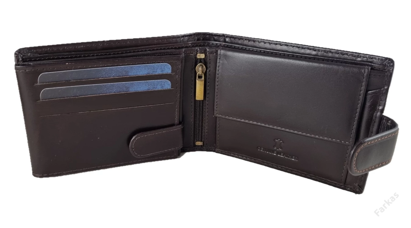 Fényes bőrből készült férfi pénztárca. Elegáns, komoly stílusú. Fedele átkapcsolóval nyílik. Belsejének elrendezése klasszikus. Papírpénztartója két rekeszből áll. Az aprópénztartó patenttal nyitható. A kártyatartó rész könyvszerűen lapozható. Összesen 9 kártyának és 4 igazolványnak van benne hely. Ezen kívül még egy kis zsebecske is található a pénztárca belsejében a  gerinc mentén. Díszdobozban szállítjuk, így ízléses ajándék lehet férfi ismerősének.