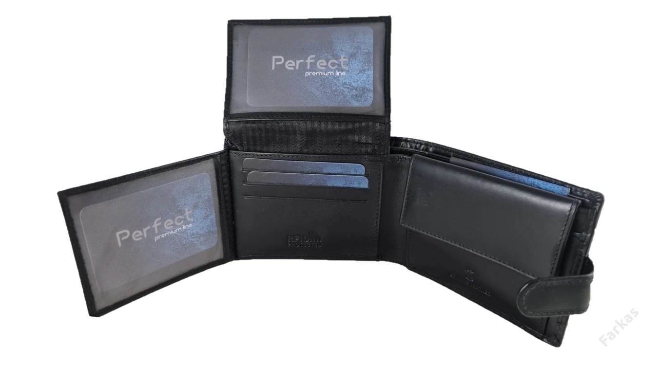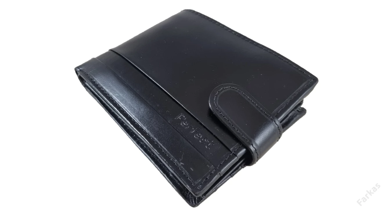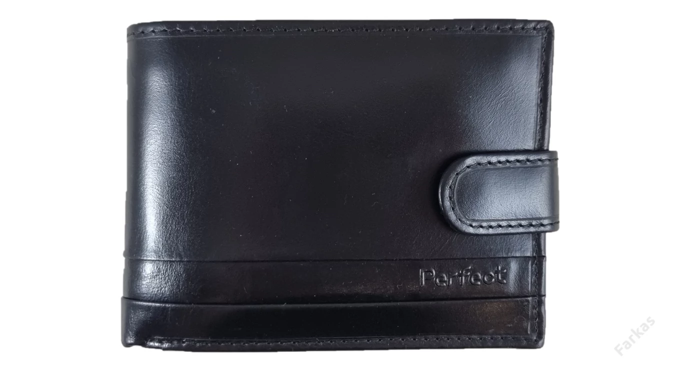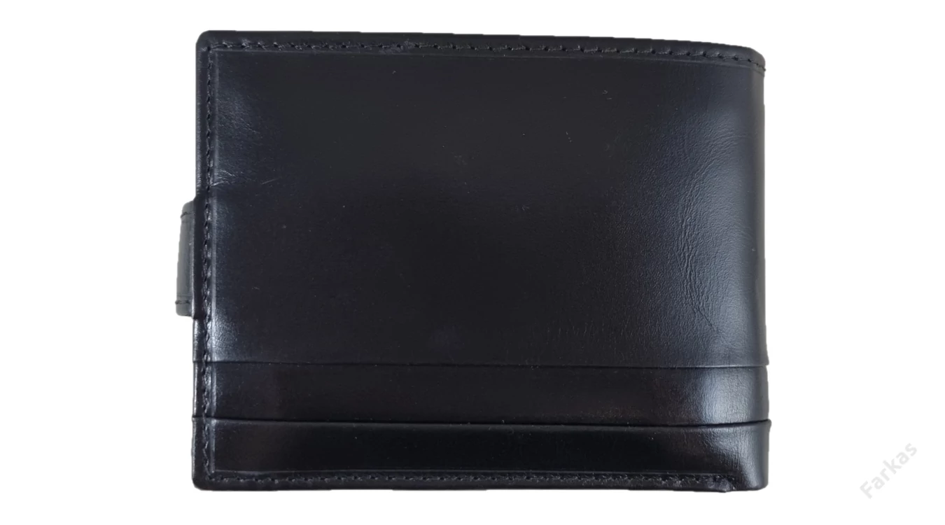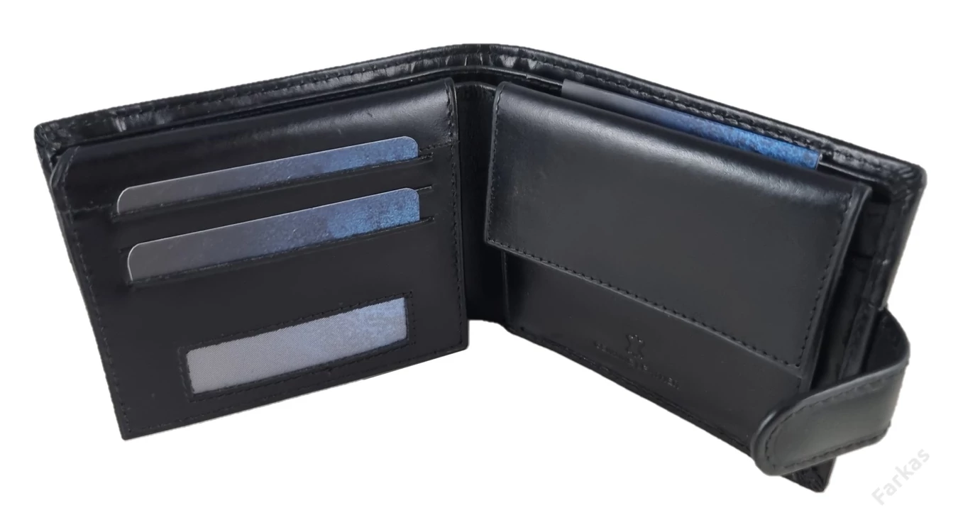 Fényes bőrből készült férfi pénztárca. Elegáns, komoly stílusú. Fedele átkapcsolóval nyílik. Papírpénztartója két rekeszből áll, mögötte el van helyezve egy cipzáras zseb. Az aprópénztartó patenttal nyitható. A kártyatartó rész felfelé és kifele lapozható, összesen 9 kártyának és 3 igazolványnak van benne hely. Díszdobozban szállítjuk, így ízléses ajándék lehet férfi ismerősének.