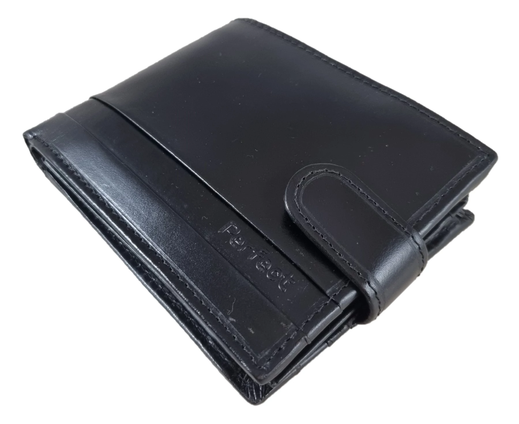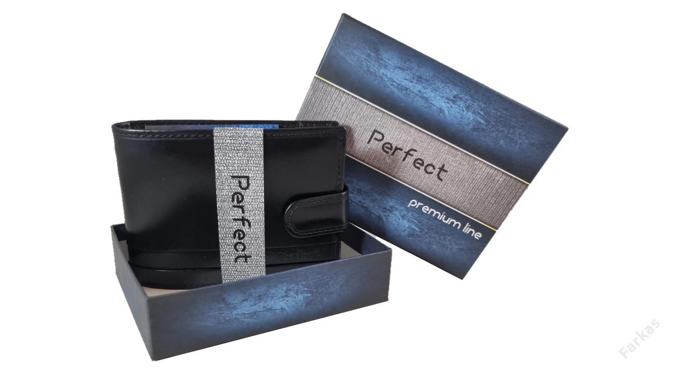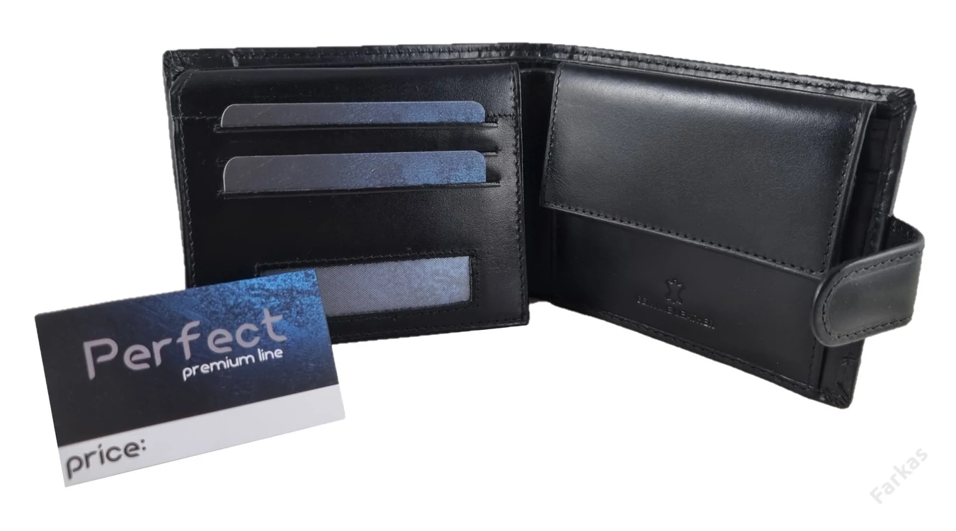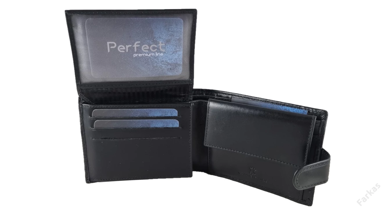 Fényes bőrből készült férfi pénztárca. Elegáns, komoly stílusú. Fedele átkapcsolóval nyílik. Papírpénztartója két rekeszből áll, mögötte el van helyezve egy cipzáras zseb. Az aprópénztartó patenttal nyitható. A kártyatartó rész felfelé és kifele lapozható, összesen 9 kártyának és 3 igazolványnak van benne hely. Díszdobozban szállítjuk, így ízléses ajándék lehet férfi ismerősének.