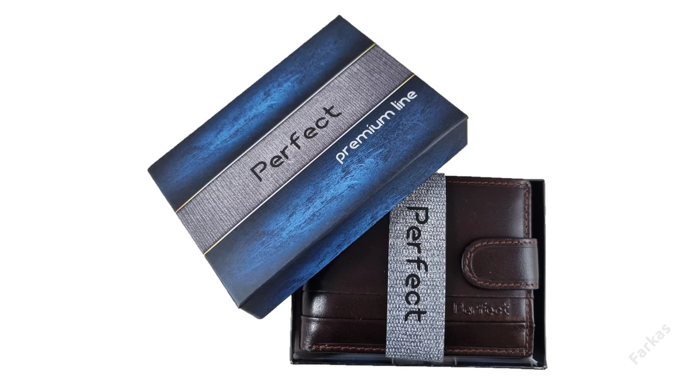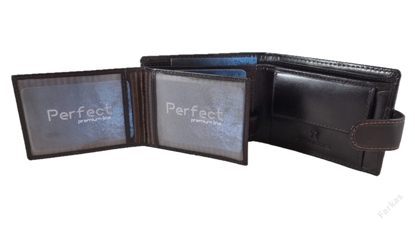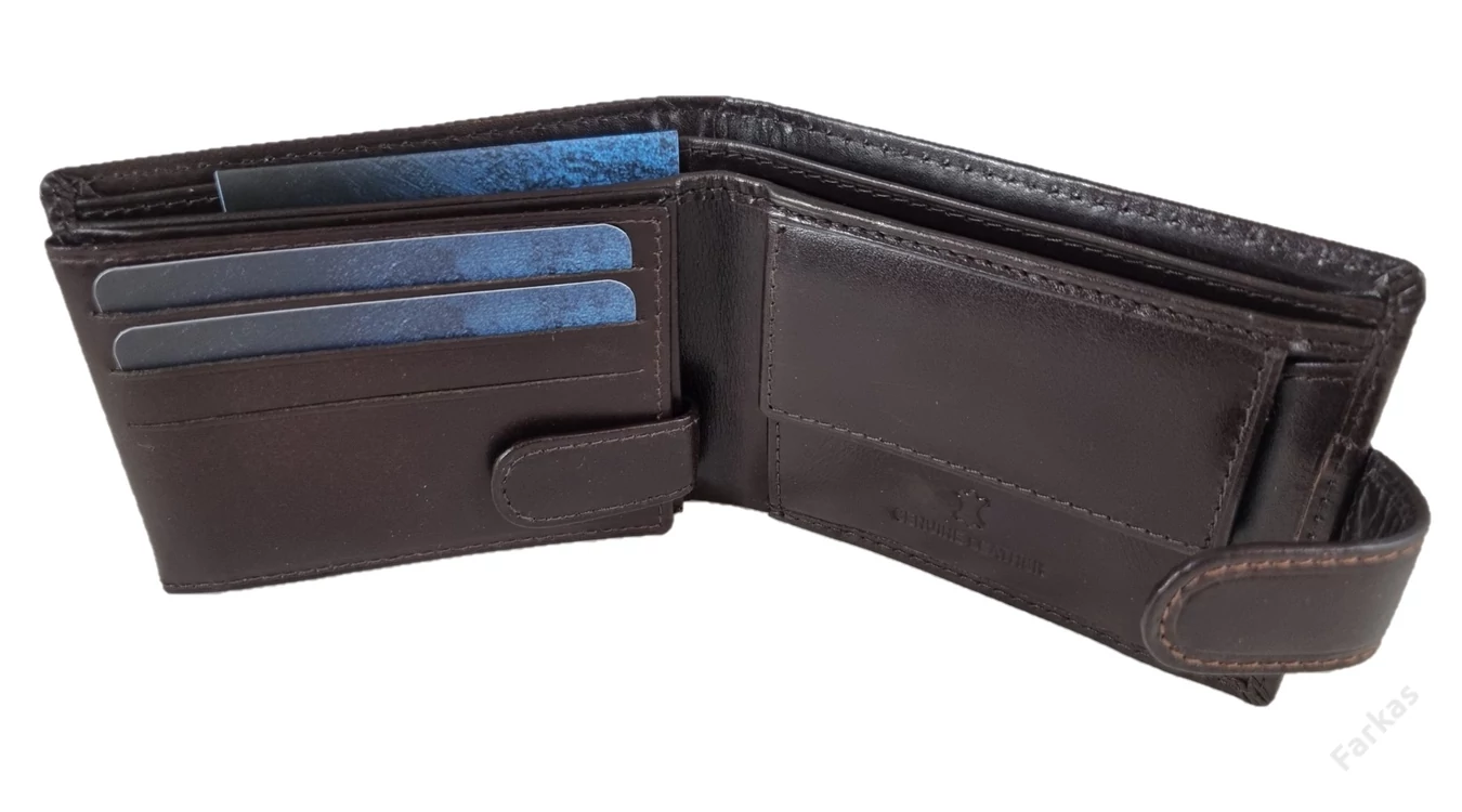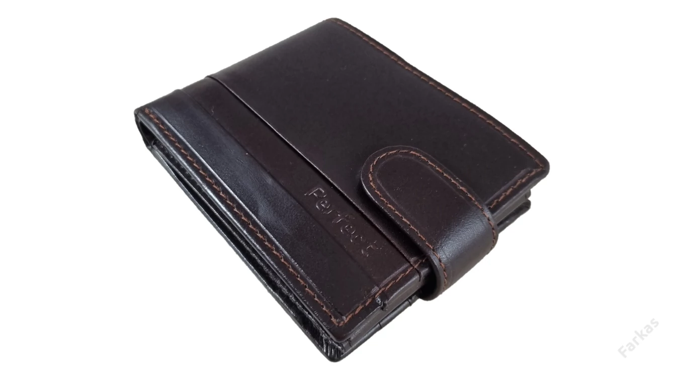 Fényes bőrből készült férfi pénztárca. Elegáns, komoly stílusú. Fedele átkapcsolóval nyílik. Belsejének elrendezése klasszikus. Papírpénztartója két rekeszből áll. Az aprópénztartó patenttal nyitható. A kártyatartó rész könyvszerűen lapozható és összesen 11 kártyának van benne hely. Díszdobozban szállítjuk, így ízléses ajándék lehet férfi ismerősének.