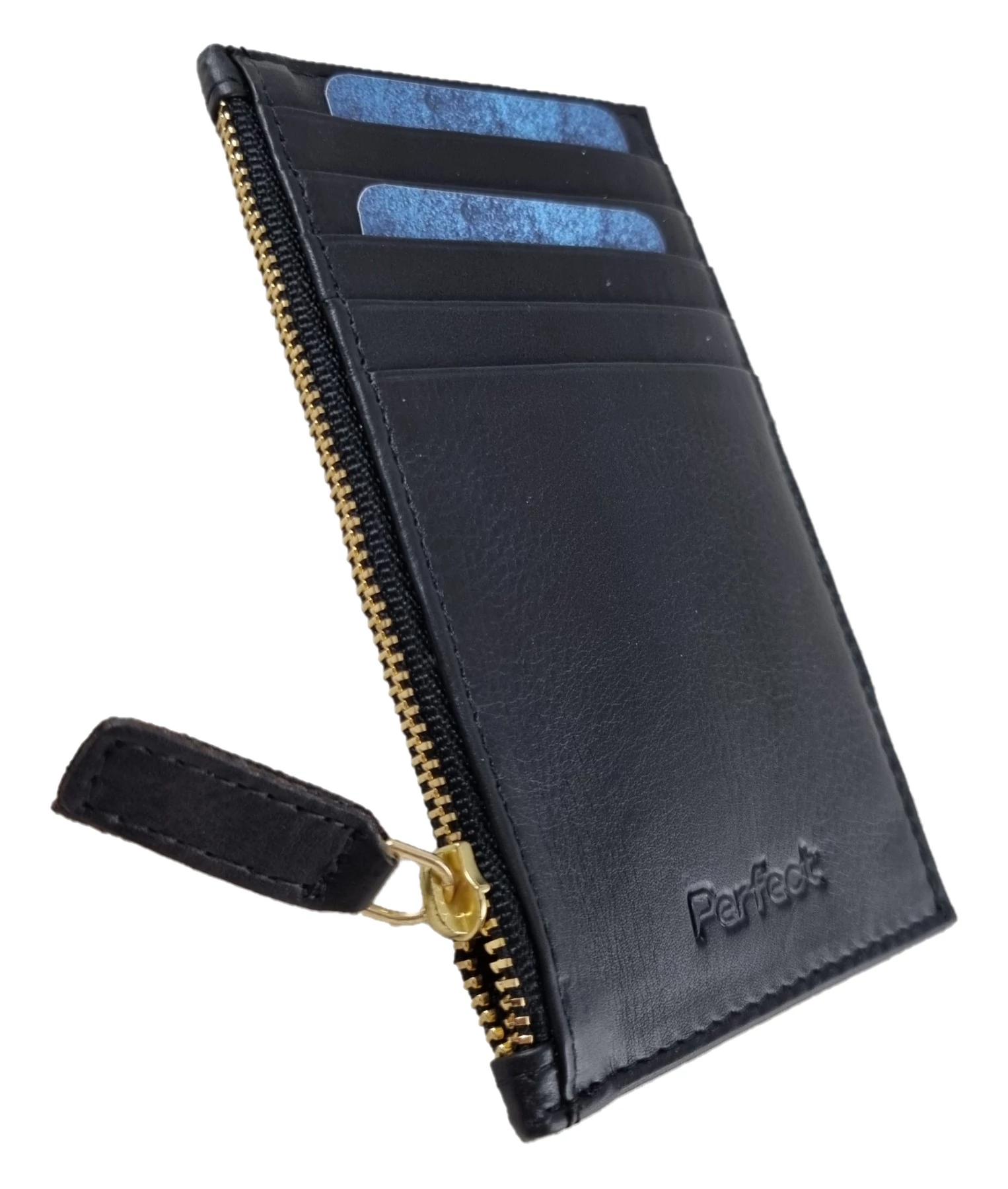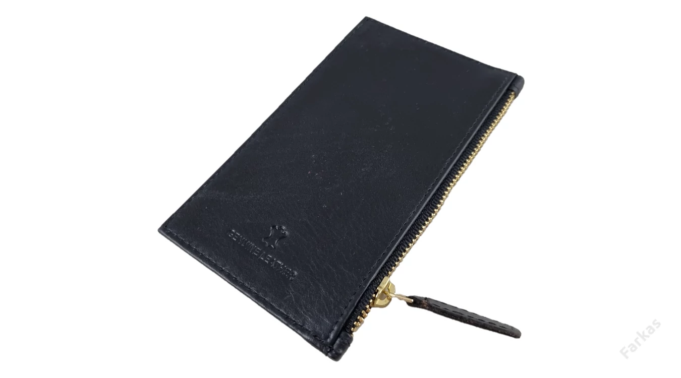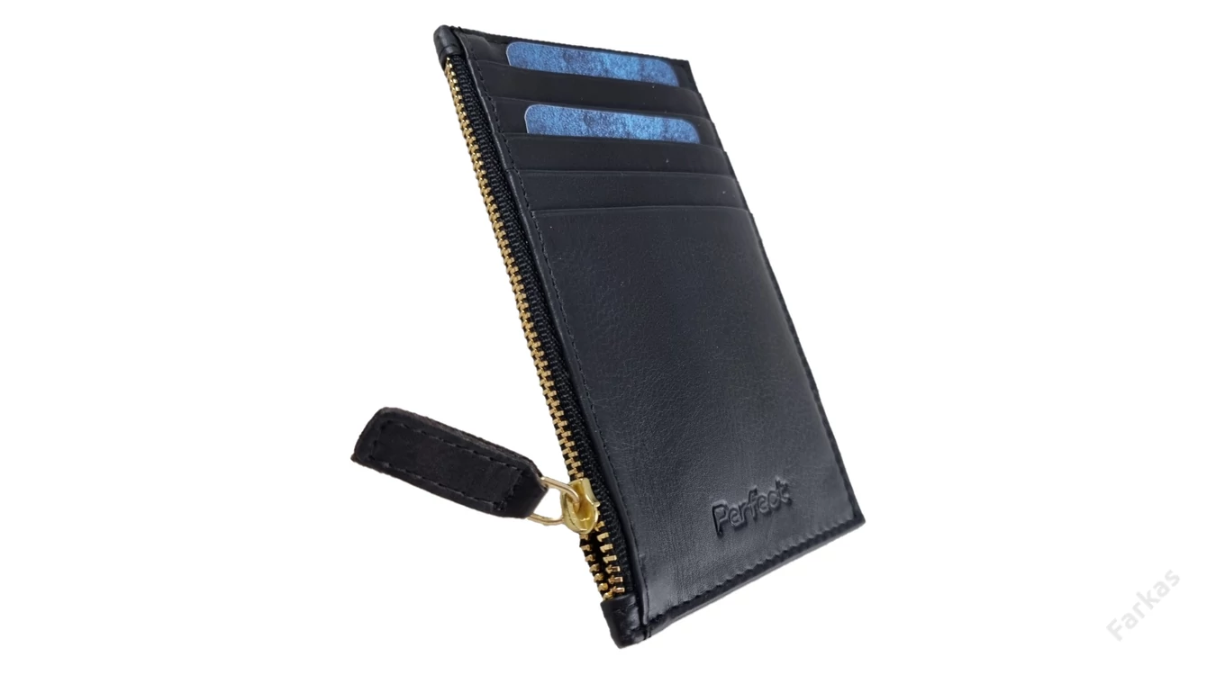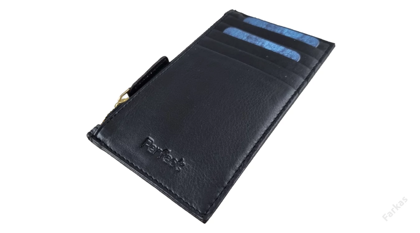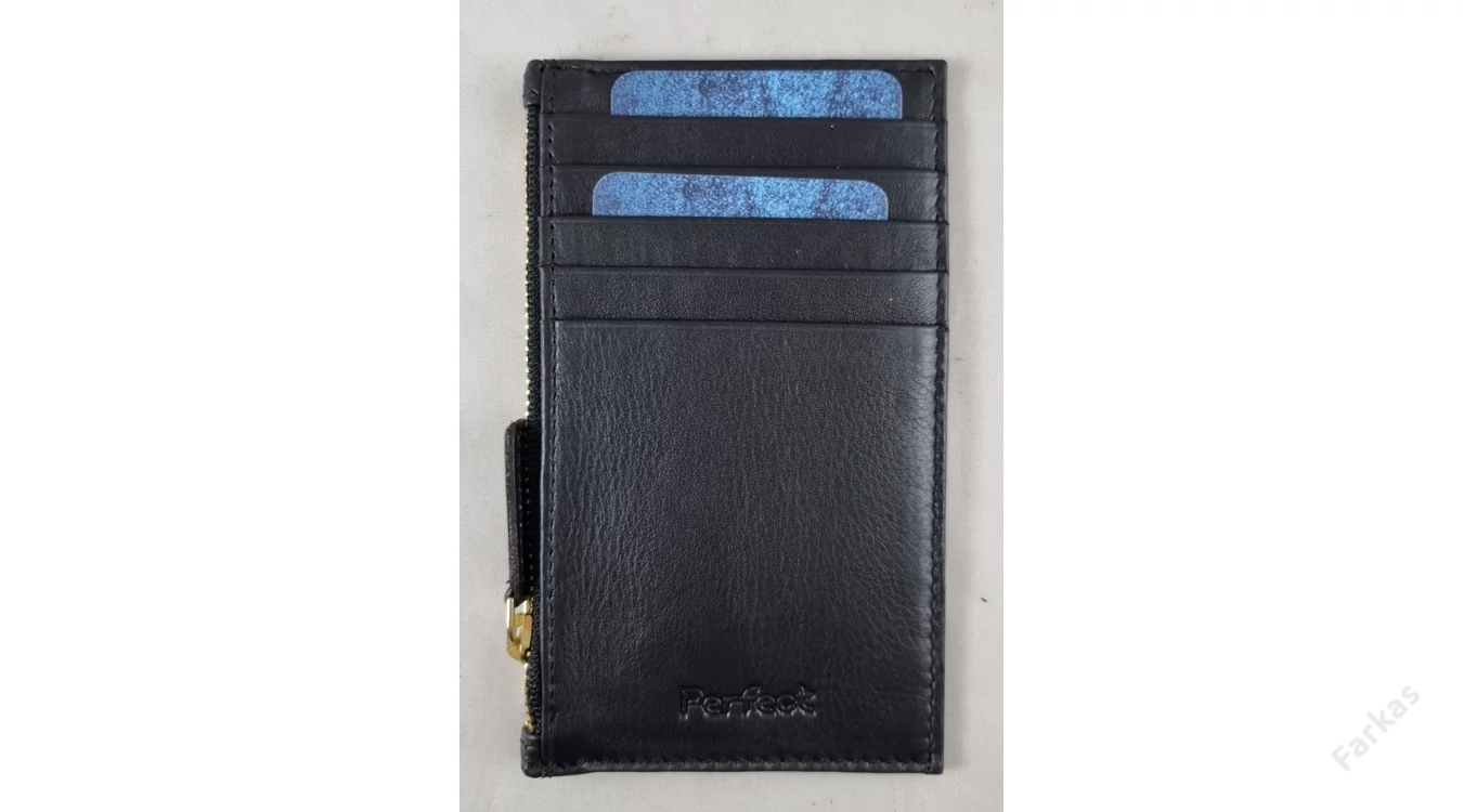 A kártyatartó elején 5 db kártya- ill. igazolványtartó hely található. Az oldalán cipzárral nyílik egy zseb, hova tovbbai iratok vagy papírpénz elfér.