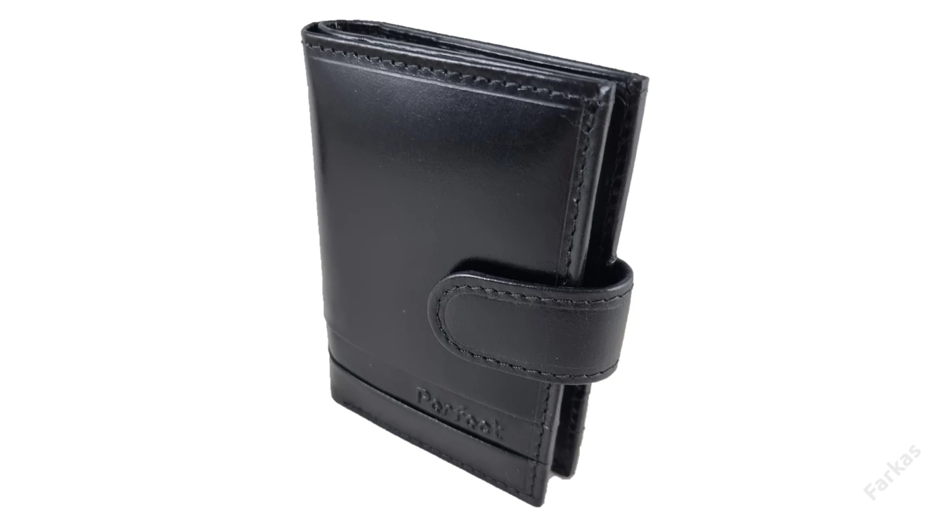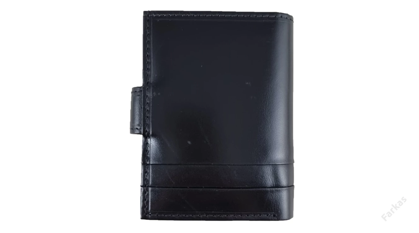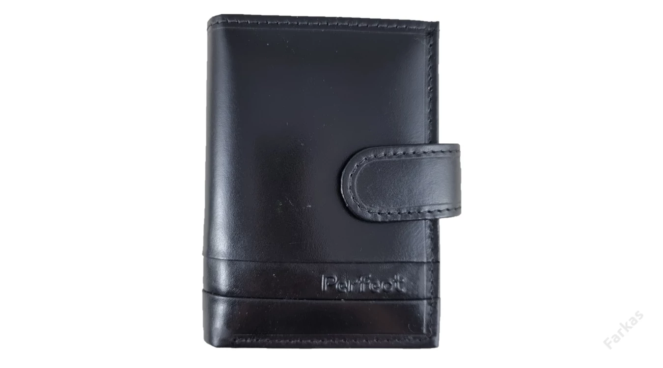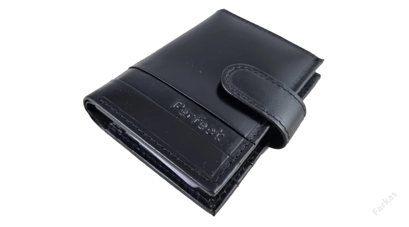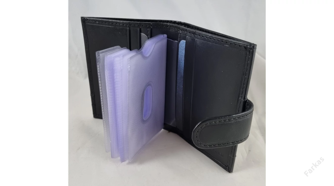 Patentos átkapcsolóval nyílik. Belsejében papírpénztartó, 4 "beépített" és 16 műanyag fóliás, kivehető kártyatartó rész található.