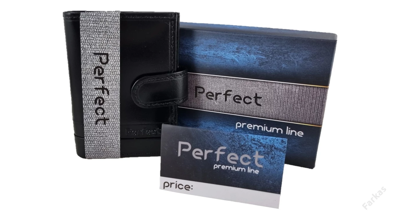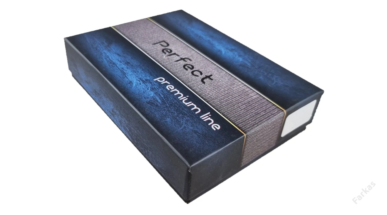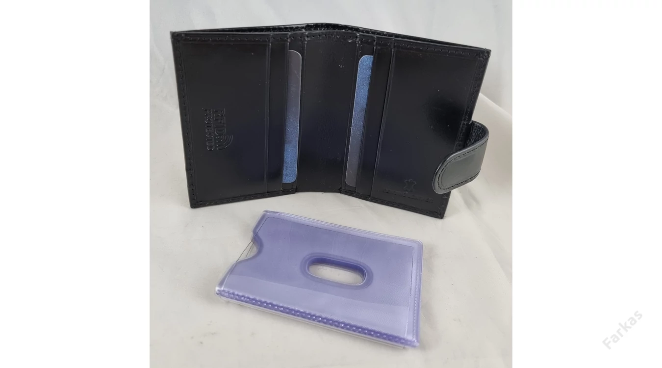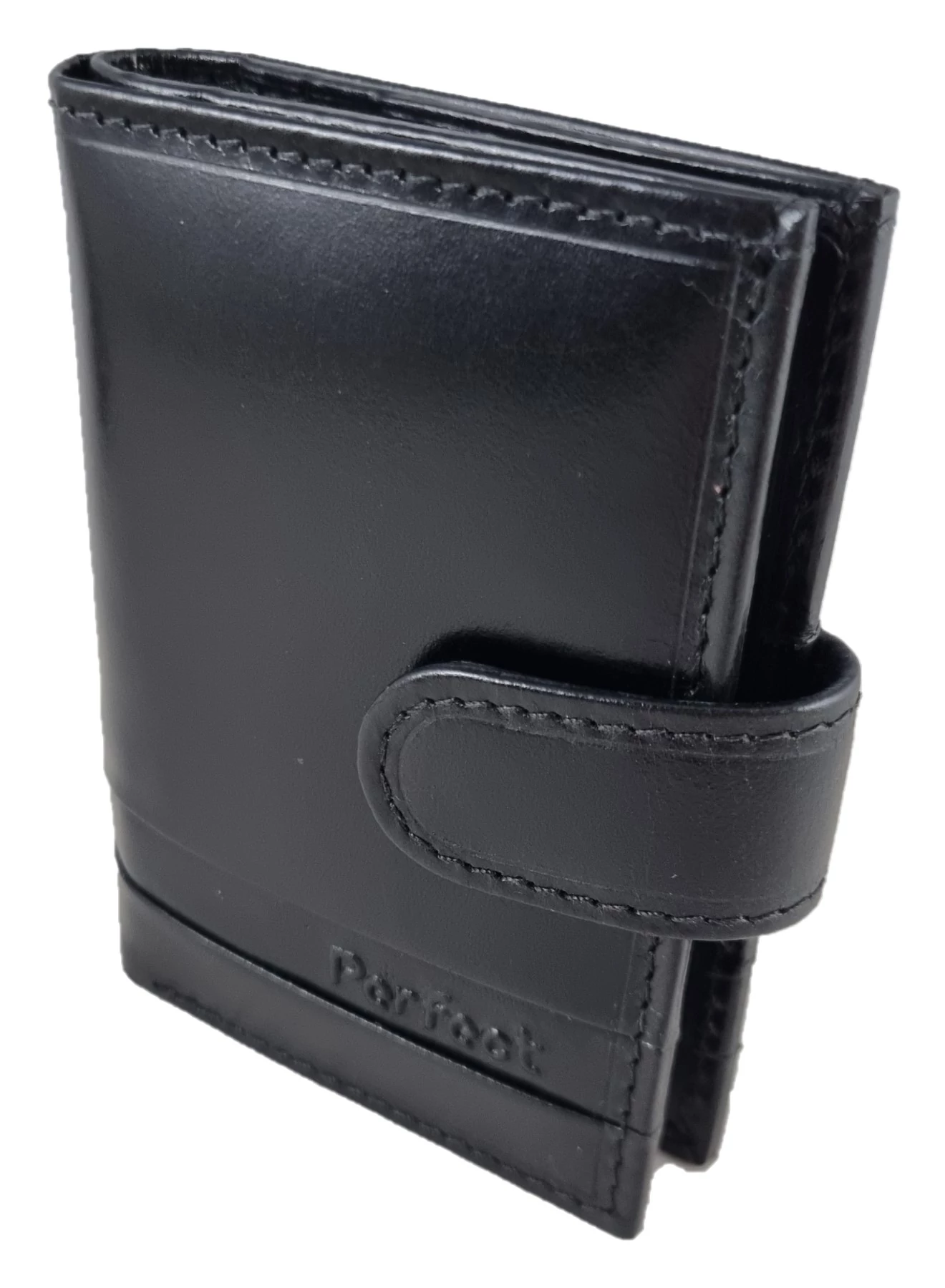 Patentos átkapcsolóval nyílik. Belsejében papírpénztartó, 4 "beépített" és 16 műanyag fóliás, kivehető kártyatartó rész található.